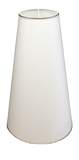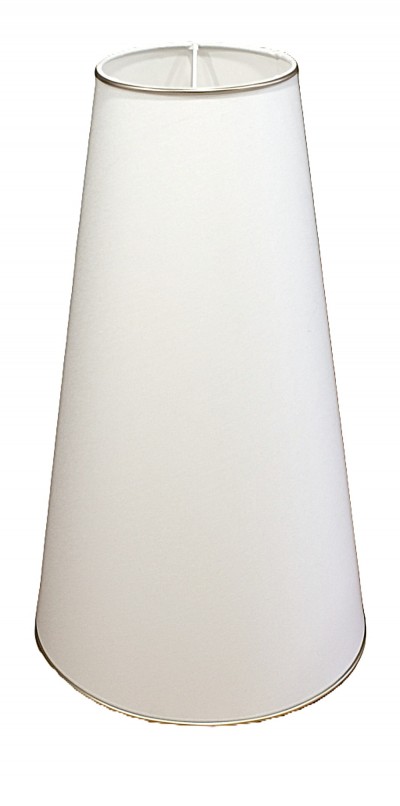 Ten abażur w kształcie stożka został wykonany z wysokiej jakości, oryginalnej bawełny. Wnętrze jest laminowane na biało, co sprawia, że światło rozprasza się równomiernie i pozostaje neutralne, bez niepożądanych odcieni. Brzeg wykończony został złotym, matowym profilem o szerokości 3 mm lub złotą lub srebrną tasiemką brokatową, o szerokości 6 mm.